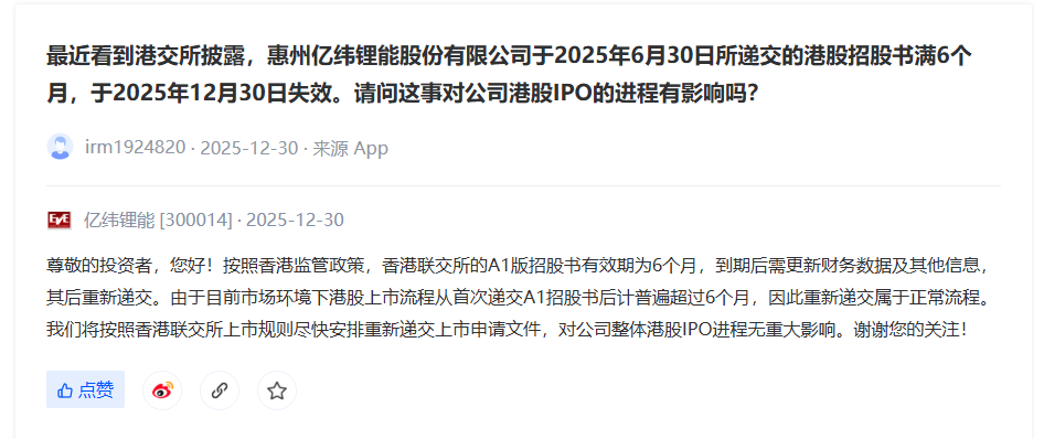 对此,亿纬锂能在深交所互动易回应称,根据香港监管政策,香港联交所的A1版招股书有效期为6个月,到期后需更新财务数据及其他信息,其后重新递交。由于目前市场环境下港股上市流程从首次递交A1招股书后计普遍超过6个月,因此重新递交属于正常流程。亿纬锂能表示,将按照香港联交所上市规则尽快安排重新递交上市申请文件,对公司整体港股IPO进程无重大影响。
