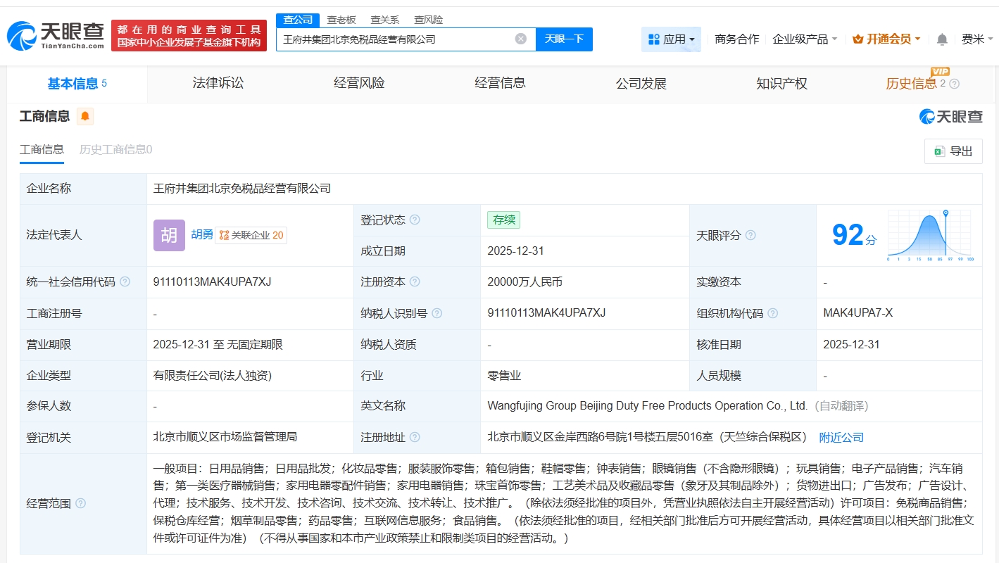 每经AI快讯,天眼查工商信息显示,近日,王府井(600859)集团北京免税品经营有限公司成立,法定代表人为胡勇,注册资本2亿元人民币,经营范围包括日用品销售、日用品批发、化妆品零售、服装服饰零售等。股东信息显示,该公司由王府井(600859)全资持股。