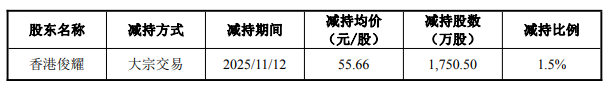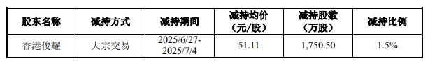 第一轮减持发生在2025年6月27日至2025年7月4日期间,俊耀集团通过大宗交易方式累计减持1750.5万股,占公司总股本1.5%,减持均价51.11元/股,合计套现约8.95亿元。本次减持后,其与一致行动人持股比例从87.48%降至85.98%,持股变动比例触及1%。