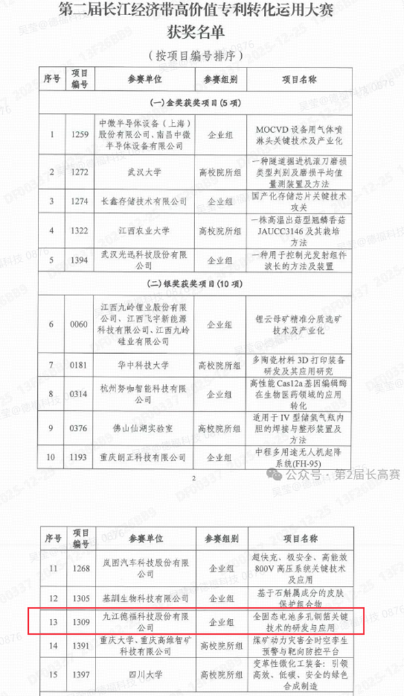 近日,第二届长江经济带高价值专利转化运用大赛在江西九江圆满落幕。九江德福科技(301511)股份有限公司(以下简称“德福科技”)携“全固态电池多孔铜箔关键技术的研发与应用”项目从1410个参赛项目中一路过关斩将,历经初赛、复赛、决赛三重考验,最终脱颖而出,成功斩获大赛银奖,其技术创新实力与专利转化价值获行业专家高度认可。