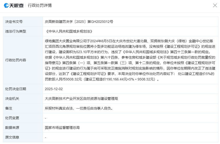 天眼查工商信息显示,绿地集团大庆置业有限公司收到行政处罚决定书(庆高新自建罚决字〔2025〕第GH2025012号)。绿地集团大庆置业有限公司于2024年8月5日在大庆市世纪大道北侧、双拥街东侧大庆(绿地)金融中心世纪峯汇项目西北角原规划审批位置将小型多功能运动场地改建为停车场,没有按照《建设工程规划许可证》的规定进行建设,建设面积为523.10平方米的行为,违反了《中华人民共和国城乡规划法》第四十三条第一款的规定。