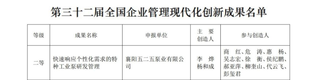 日前,全国企业管理现代化创新成果审定委员会发布第三十二届全国企业管理现代化创新成果名单,泵业公司申报的《快速响应个性化需求的特种工业泵研发管理》从966项申报成果中脱颖而出,荣获二等奖。