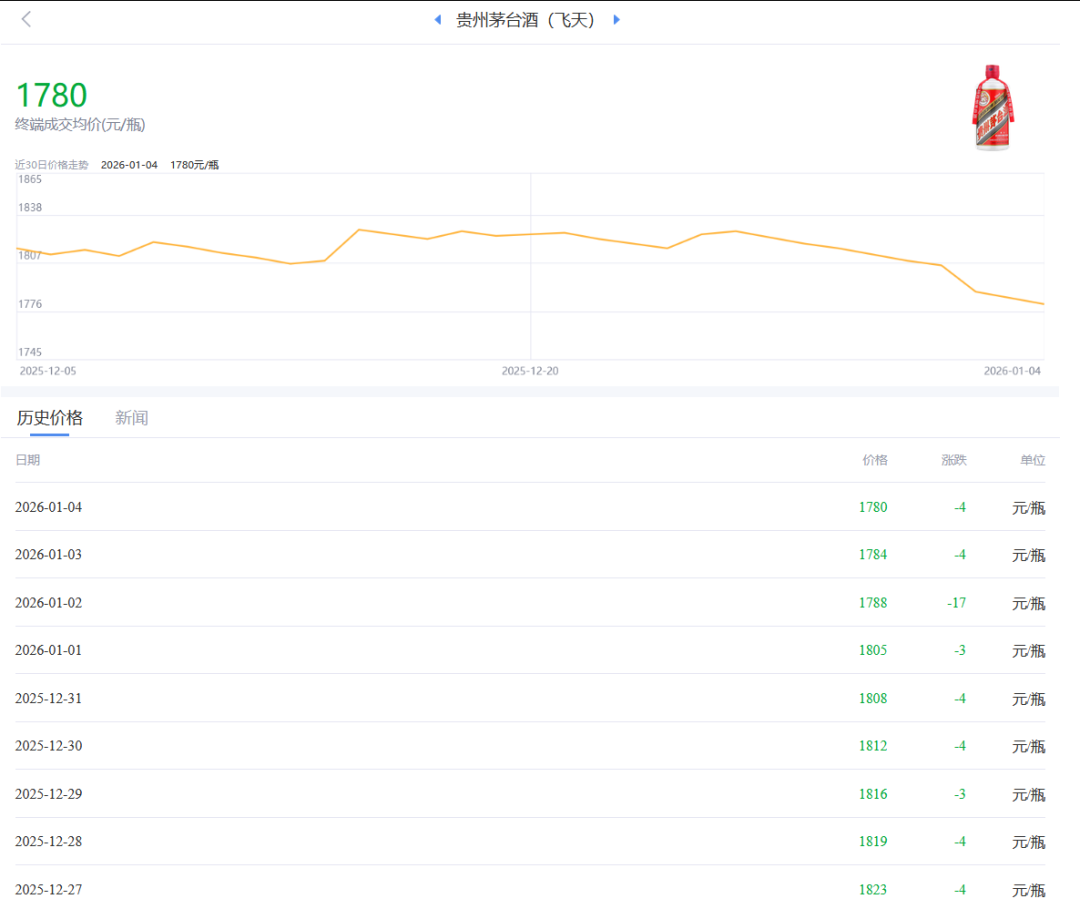 而在社会终端渠道上,电商平台上再次出现低于1499元指导价的售价。第三方平台“酒价内参”数据显示,飞天茅台过去24小时终端零售均价为1780元/瓶,回落了4元,已连跌9天,累计达23.59%;而2026年以来的4天,跌幅达到了15.49%。