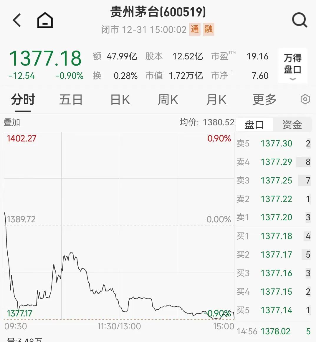 资本市场上,贵州茅台的股价已连续4个交易日下跌;在2025年12月18日至31日的10个交易日中,有8个交易日均收跌。截至2025年12月31日收盘,贵州茅台报1377.18元/股,跌幅为0.90%;2025年累计跌6.29%。