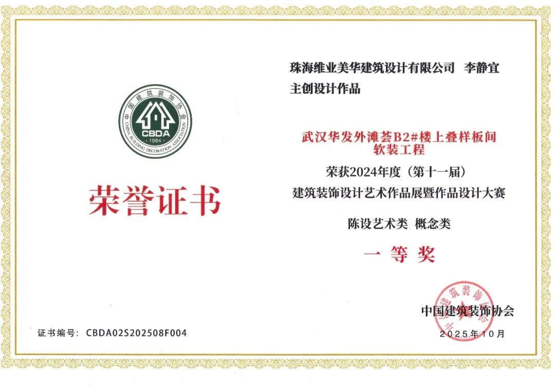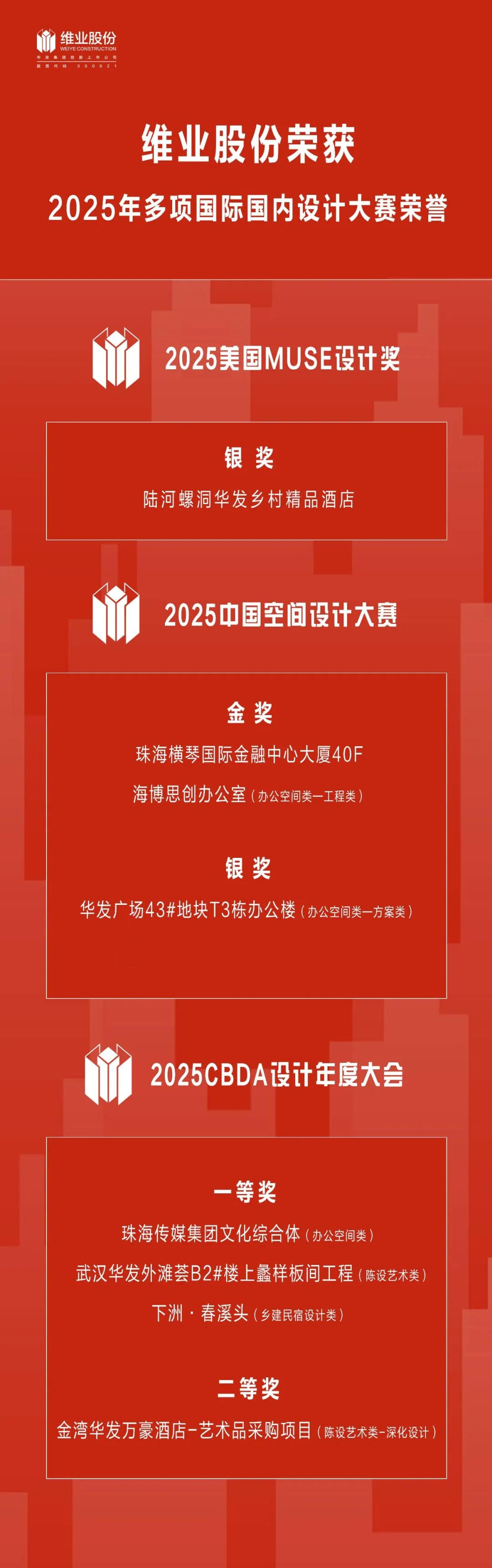 在2025年CBDA设计年度大会上,维业股份下属美华设计的设计作品凭借独特的创意、深厚的文化内涵与专业的表现,荣获3个一等奖、1个二等奖的荣誉佳绩。