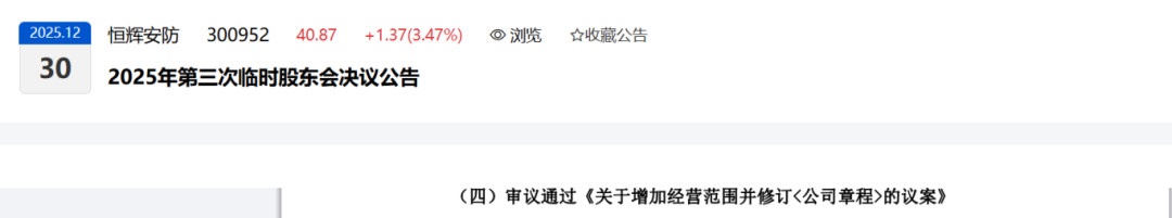近日,恒辉安防(300952)召开2025年第三次临时股东会,审议通过了《关于增加经营范围并修订<公司章程>的议案》,正式将“智能机器人的研发;智能机器人销售;人工智能硬件销售;物联网技术研发”等机器人相关业务纳入经营范围。这一重要举措是公司深耕技术积累、拓展机器人业务版图的战略落地,标志着恒辉安防在机器人业务领域的布局进一步深化,长期发展路径更趋清晰。
