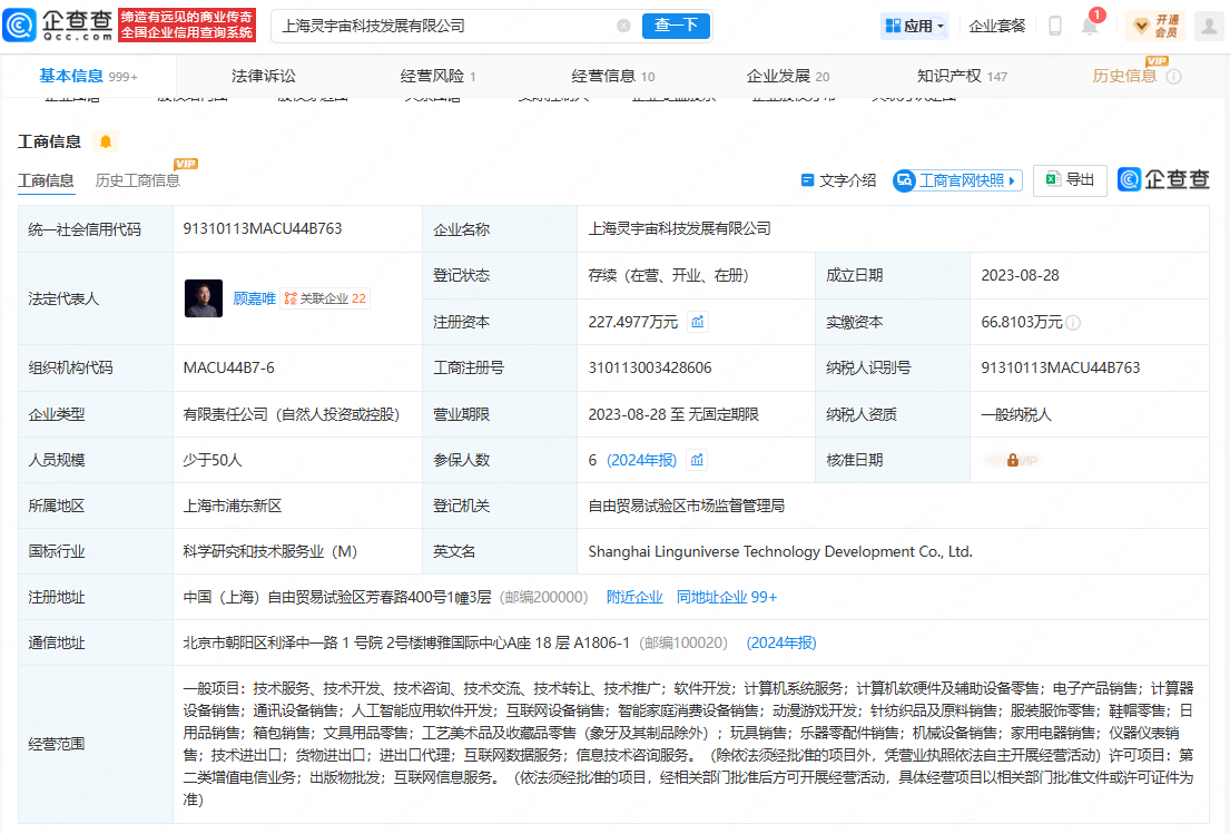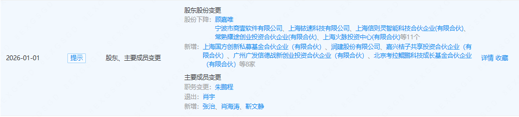 企查查APP显示,近日,上海灵宇宙科技发展有限公司发生工商变更,新增润建股份(002929)(002929.SZ)、滴滴关联公司嘉兴桔子共享投资合伙企业(有限合伙)等为股东,同时注册资本增至227.5万元。公开信息显示,灵宇宙是一家AI+消费机器人公司。