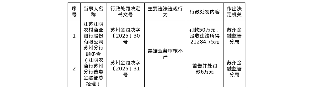 罚单显示,江苏江阴农村商业银行股份有限公司苏州分行的主要违法违规事实(案由)为:票据业务审核不严。