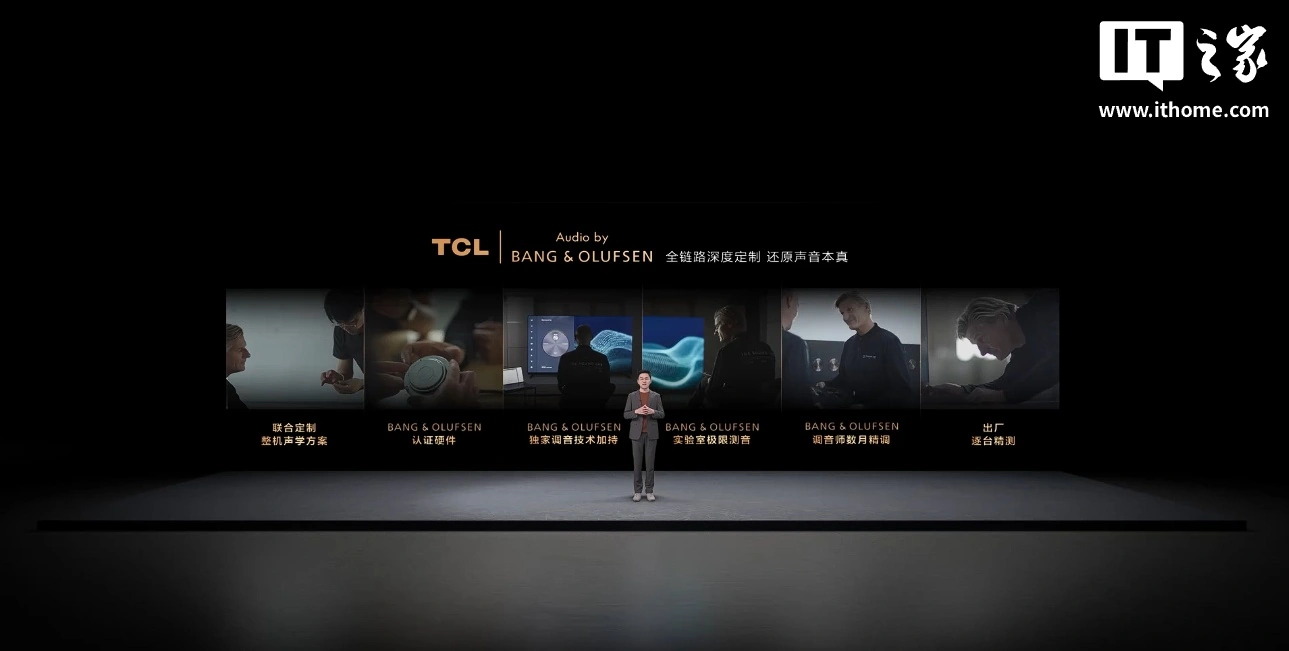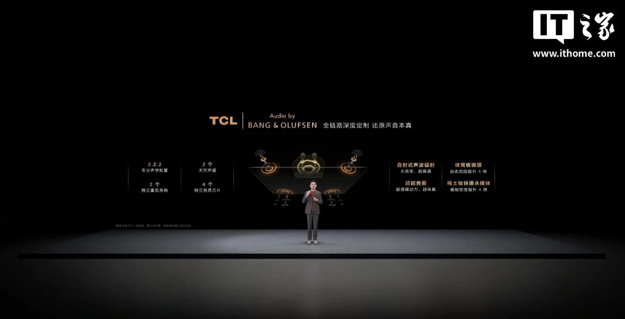 TCL 还和 BANG&OLUFSEN 合作,Q10M Pro 采用 2.2.2 专业声学配置,包括 2 个天空声道、2 个独立重低音炮、4 个独立音质芯片,配备蜂窝板振膜、超能音圈、稀土钕铁硼永磁体,支持直射式声波辐射。