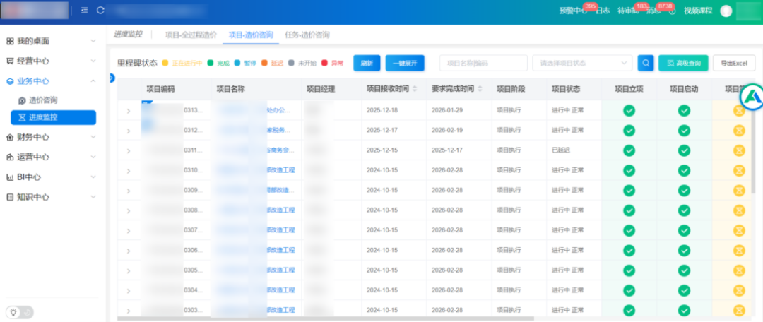 业务进度管理可视化是天栋数字化建设的一大亮点。通过智能进度看板,项目负责人及公司领导可实时掌握项目进展,及时发现问题并干预。造价业务驾驶舱通过BI看板,为企业领导提供直观的业务全景视图,辅助决策制定。