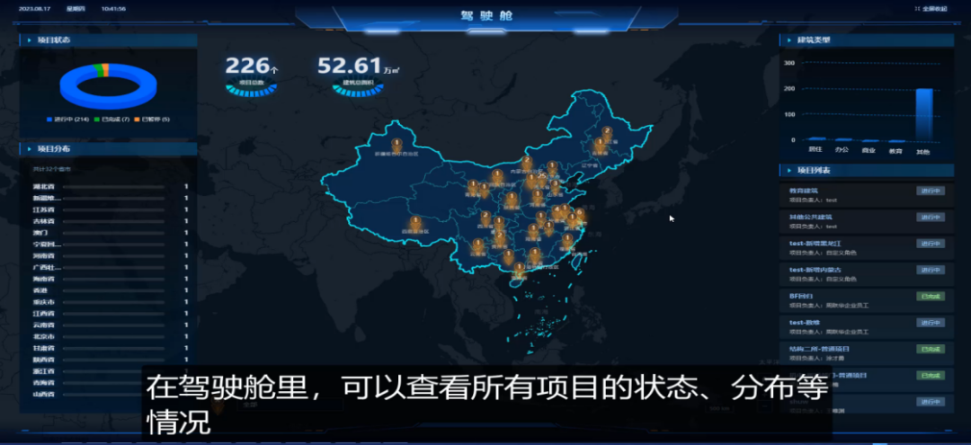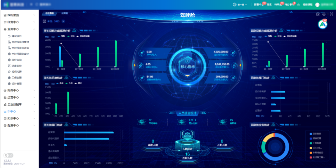 设计业务驾驶舱以科技感的界面,使管理人员能够快速了解企业当前项目列表、分布情况及各项目进展。系统集成了员工工时统计、质量评估等功能,实现对项目的精准管控。