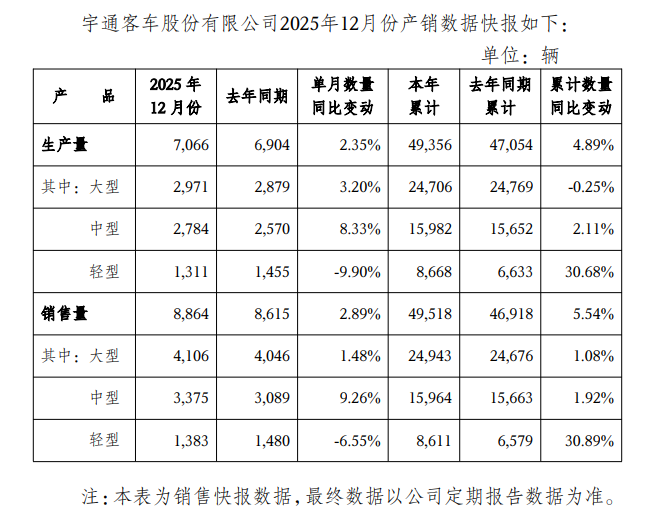 1月5日,宇通客车(600066)(600066.SH)发布2025年12月份产销数据快报。根据快报信息,2025年12月公司生产7006辆,同比上涨2.35%;2025年累计生产49356辆,同比上涨4.89%。