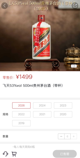 日前,i茅台APP一度登顶苹果App Store应用商店免费购物榜。《经济参考报》记者注意到,自2026年1月1日飞天茅台酒上线“i茅台”APP以来,已连续多日“上线即售罄”。1月5日上午,记者在“i茅台”APP看到,2026年份、定价1499元的500毫升飞天茅台酒显示“已售罄”;在其他购物平台上,2025年份的该款酒近90天同款均价为1908.36元。此外,马年生肖酒的预约通道也都显示名额已满。截至发稿前,“i茅台”APP在App Store免费应用排行榜上排名第6,在免费购物排行榜上名列第二位,仅次于抖音商城。