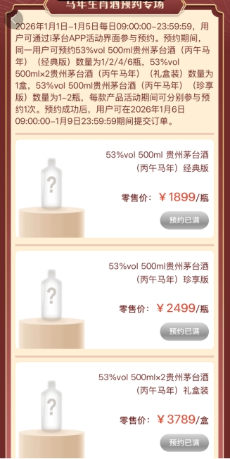 此外,针对市场上出现的“假茅台”等,1月4日晚,“贵州茅台”公众号公告称,近期线上平台再次出现以茅台名义发布的招商信息,声称“1169元飞天直采”“1169茅台申购”“茅台1169元飞天直供全国开放”“茅台将1169元飞天企业直采通道从试点阶段推向全国版图”等。中国贵州茅台酒厂(集团)有限责任公司及下属子公司从未授权或委托任何主体发布以上信息。公司将积极配合有关部门调查处理,依法追究有关责任主体法律责任,切实维护市场秩序和消费者权益。
