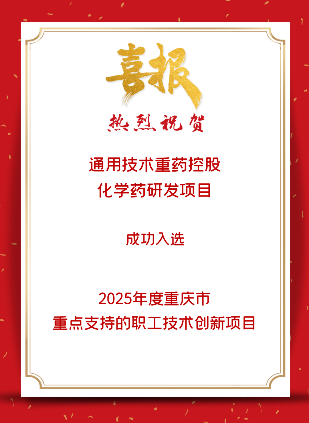 近日,重庆市总工会正式发布《关于2025年度重点支持的职工技术创新项目的通知》,通用技术重药控股(000950)申报的化学药研发项目成功入选“2025年度重庆市重点支持的职工技术创新项目”。