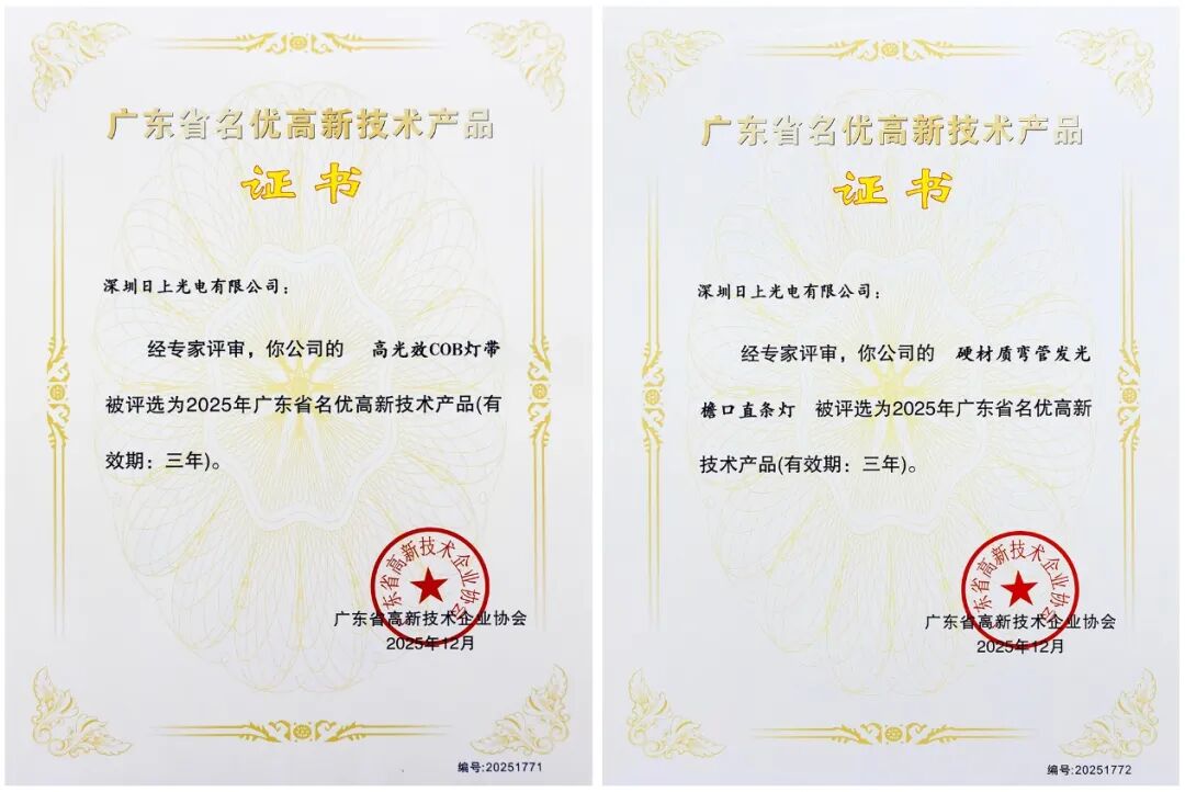 广东省名优高新技术产品认证由广东省科学技术厅主导,是原高新技术产品评选的升级版,其认定门槛堪称“严苛”,从技术壁垒高、创新性强及市场认可度等维度考核企业。2024年广东省名优高新技术产品评选,全省仅3919项产品通过认证,涵盖新材料、高端装备、绿色低碳等战略性领域。日上光电的COB灯带能和硬管直条灯从众多竞争者中脱颖而出,正是对其技术原创性、产品成熟度及市场影响力的全面肯定。