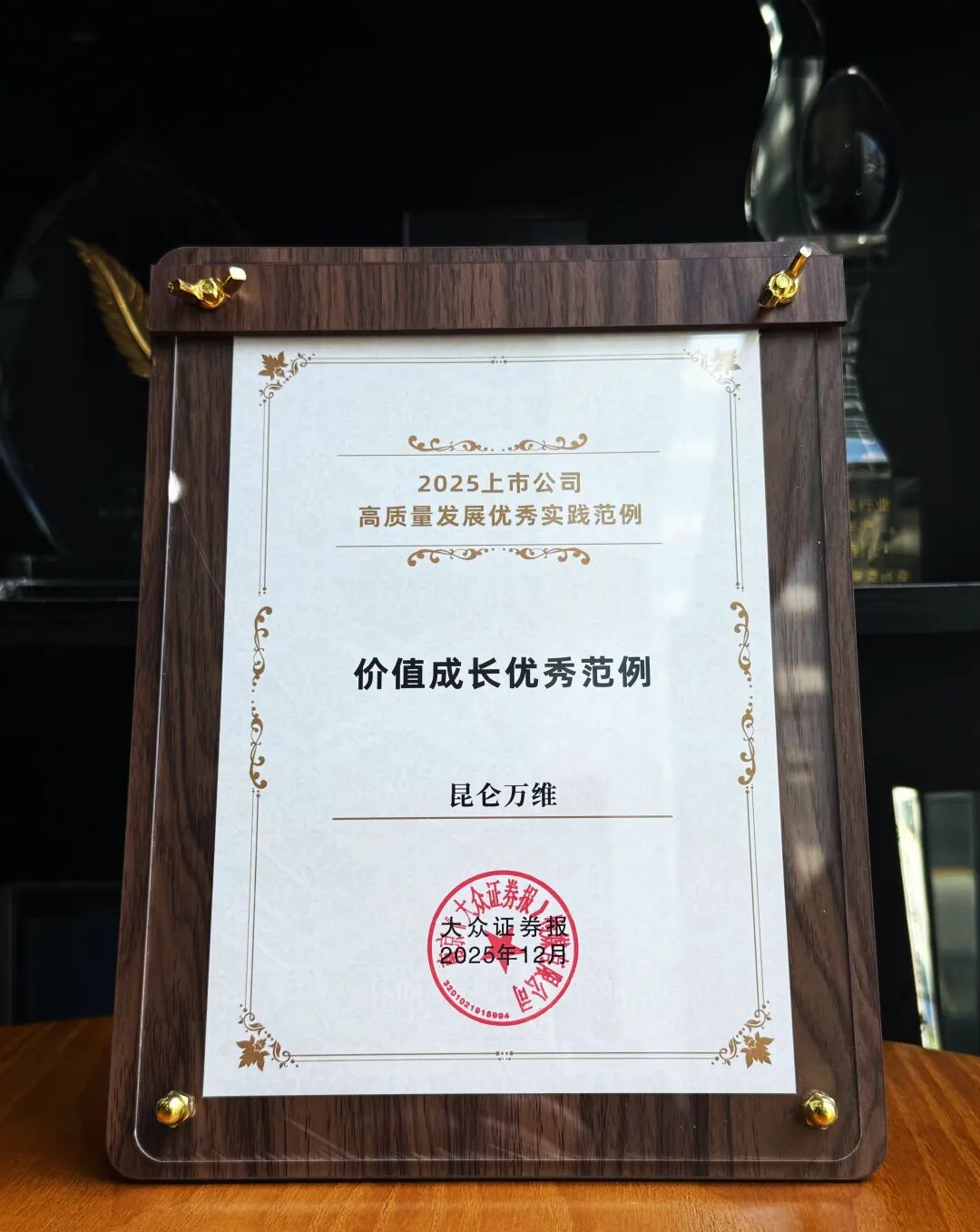 近日,大众证券报开展2025上市公司高质量发展交流会,同步组织高质量发展优秀实践范例评选。昆仑万维凭借在价值创造、可持续发展等方面的优异表现,荣获“上市公司高质量发展优秀实践案例-价值成长优秀范例”称号。