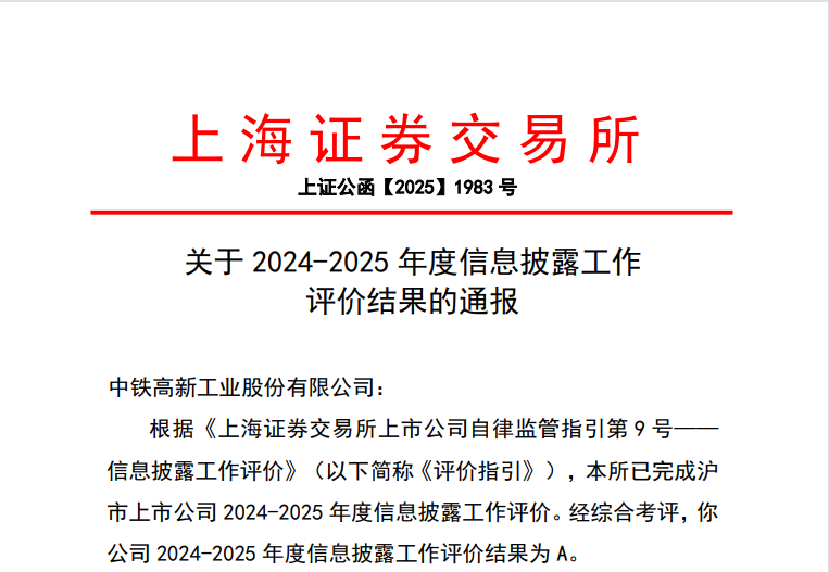 信息披露是上市公司与资本市场沟通的核心桥梁。中铁工业始终坚守真实、准确、完整的原则,规范开展信息披露工作,及时、公平披露各类信息,持续提升定期报告、临时公告等披露材料的质量。上海证券交易所2024-2025年度信息披露评价显示,公司再次蝉联沪市上市公司信息披露最高评级A级,系重组上市以来连续第八年获此殊荣,本年度沪市仅不足20%的公司获评A级,近8年连续获A级的公司占比仅2.8%;同时,公司凭借规范高效的信息披露管理体系,荣获中国证券报2025年度金牛奖“金信披奖”。