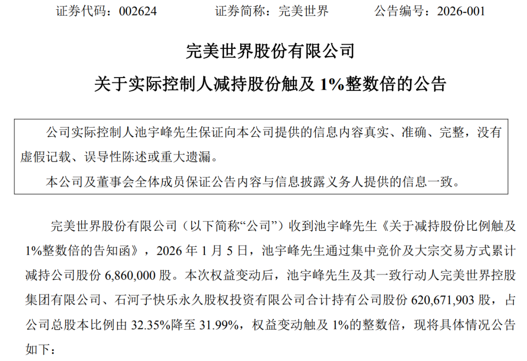 1月5日晚间,完美世界公告,公司收到实际控制人池宇峰《关于减持股份比例触及1%整数倍的告知函》,2026年1月5日,池宇峰通过集中竞价及大宗交易方式累计减持公司股份686万股。本次权益变动后,池宇峰及其一致行动人完美世界控股集团有限公司、石河子快乐永久股权投资有限公司合计持有公司股份620671903股,占公司总股本比例由32.35%降至31.99%。池宇峰减持原因为自身资金需求。