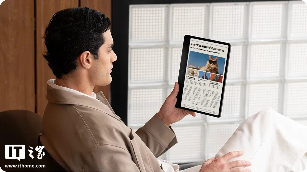 此外,这款设备内置 8000mAh 电池,支持 33W 快充,配备 1300 万像素主摄,内置双扬声器,主打会议场景,配备 8 麦克风阵列,可提供更加清晰的收音体验,支持手写笔,支持 AI 搜索笔记,还可进行语音转文字,在视频会议等场景下较为实用。