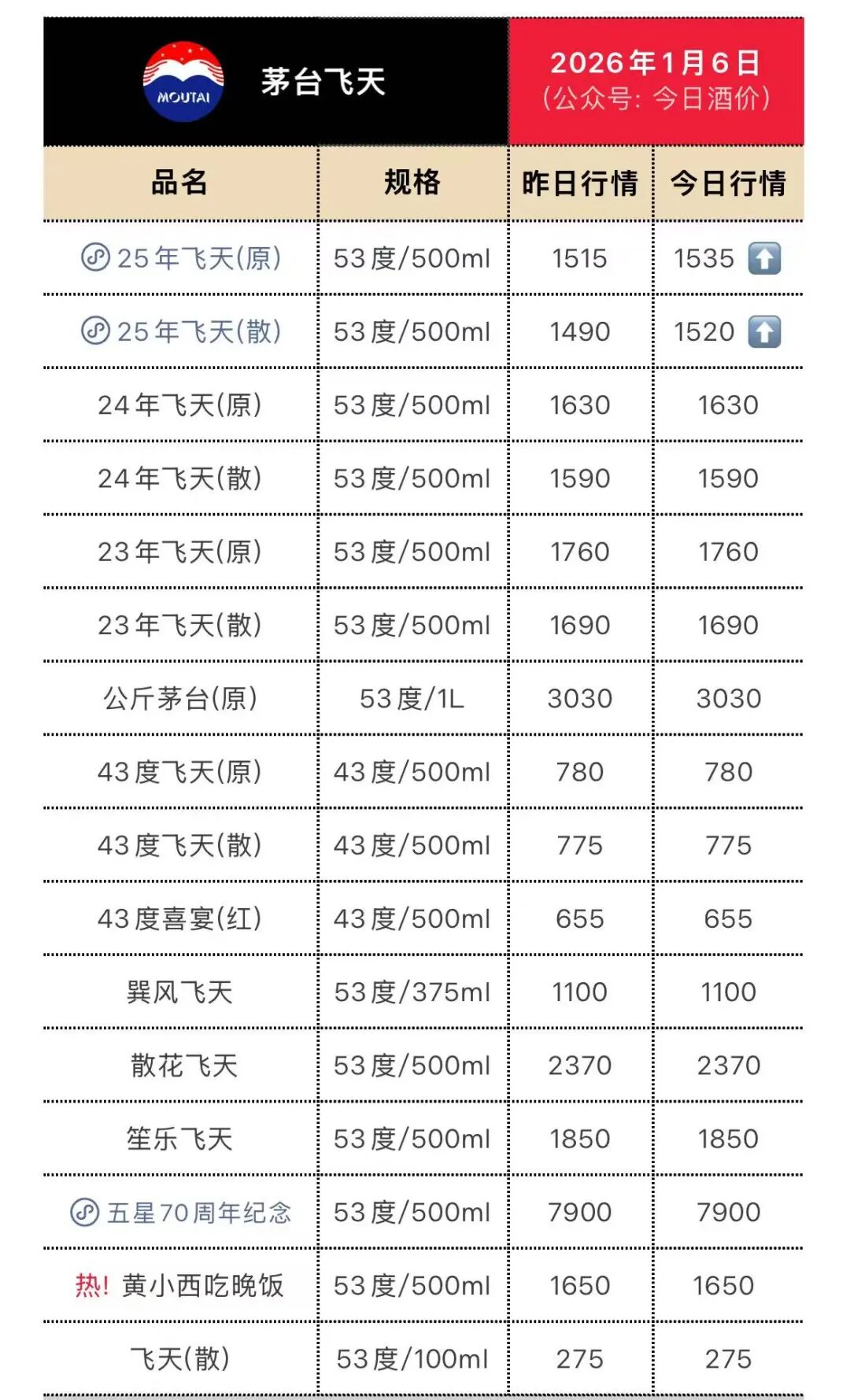 据“今日酒价”,2026年1月6日,飞天茅台批发参考价回升。25年飞天茅台原箱较前一日上涨20元/瓶,至1535元/瓶;25年飞天茅台散瓶升至1520元/瓶,较前一日上涨30元/瓶。茅台其他品类价格暂时未变。