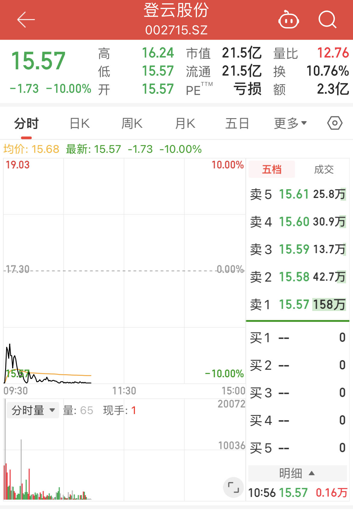1月6日,上证指数突破前高4034.08点,刷新10年来新高,但在牛市氛围下,登云股份(002715)(002715.SZ)开盘即遭遇跌停,截至10时57分,报15.57元/股,总市值较前一交易日大幅缩水,为当前A股市场唯一非ST跌停股。