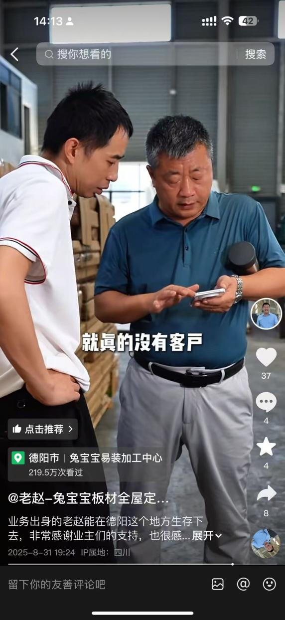 2024年8月,德阳兔宝宝(002043)开始更新抖音账号,积极拓展线上客户。由老板赵海波亲自出镜,讲设备、讲工艺、讲细节,仅用短短三个月便取得了显著成效:月留资超过200条,成交率超过30%。到现在,账号已经持续更新一年时间,让我们来看看新零售给赵海波门店带来的变化。