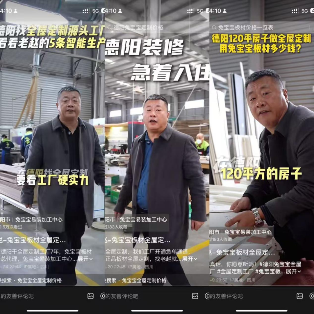 口碑的积累,让德阳兔宝宝的线上影响力形成了良性循环。不少成交客户主动在抖音评论区分享装修效果,或是推荐亲友前来咨询,这种“老带新”的线上裂变,进一步降低了获客成本,也让兔宝宝品牌在德阳全屋定制市场的辨识度越来越高。曾经有客户在到店后直言:“刷抖音刷到老赵讲板材工艺,觉得特别专业,比跑三家门店问得还清楚,过来看看实物就直接定了。”