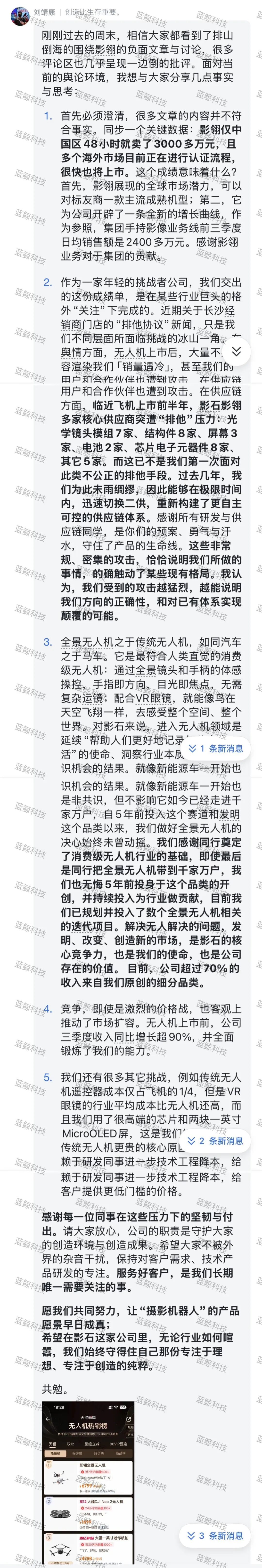 此外,公开信还回顾了公司曾在极短时间内完成供应链第二供应商切换的经历,并强调未来将继续坚守全景无人机品类创新,通过技术迭代持续降低成本。
