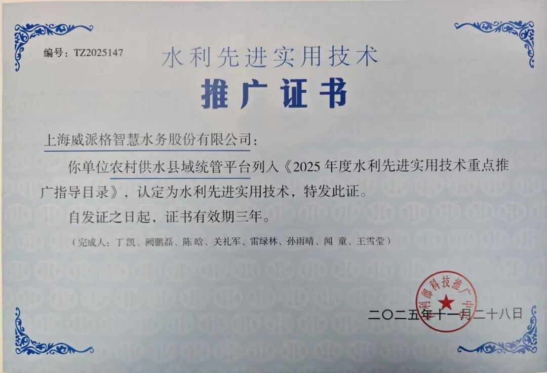 此次入选《2025 年度水利先进实用技术重点推广指导目录》,是对威派格在农村供水领域技术研发与应用实践的高度肯定。未来,威派格将继续以技术创新为核心,深化平台在全国农村供水县域统管中的推广应用,为全面提升我国农村供水保障水平贡献坚实力量。