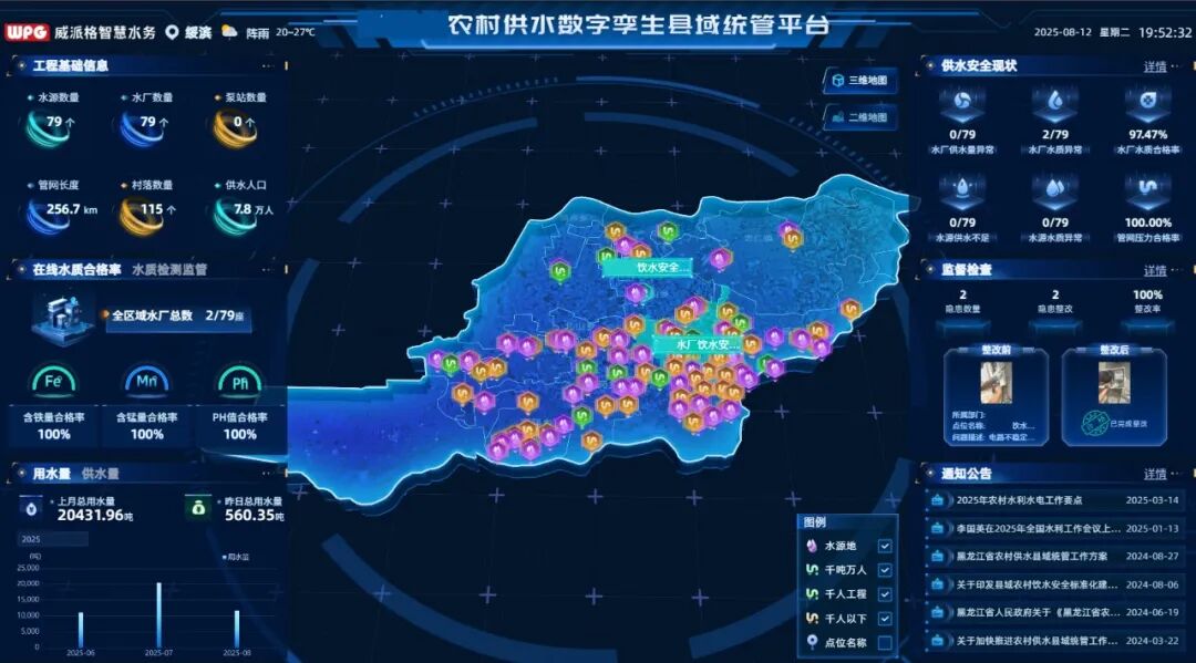 威派格紧扣政策导向与行业痛点,针对性破解农村供水 “点多、面广、量大” 导致的监管效能不足、运管成本高、风险管控弱、智慧化水平低等难题,研发的农村供水县域统管平台成为政策落地的关键技术支撑。