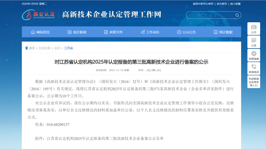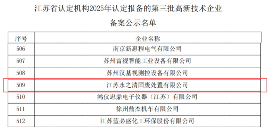 近日,全国高新技术企业认定管理工作领导小组办公室发布《对江苏省认定机构2025年认定报备的第三批高新技术企业进行备案的公示》。永清环保(300187)旗下全资子公司——江苏永之清固废处置有限公司(以下简称“江苏永之清”)凭借扎实的技术实力,顺利通过复审,再次荣获“国家高新技术企业”认定,这标志着公司在技术创新与可持续发展方面持续获得国家层面的权威认可。