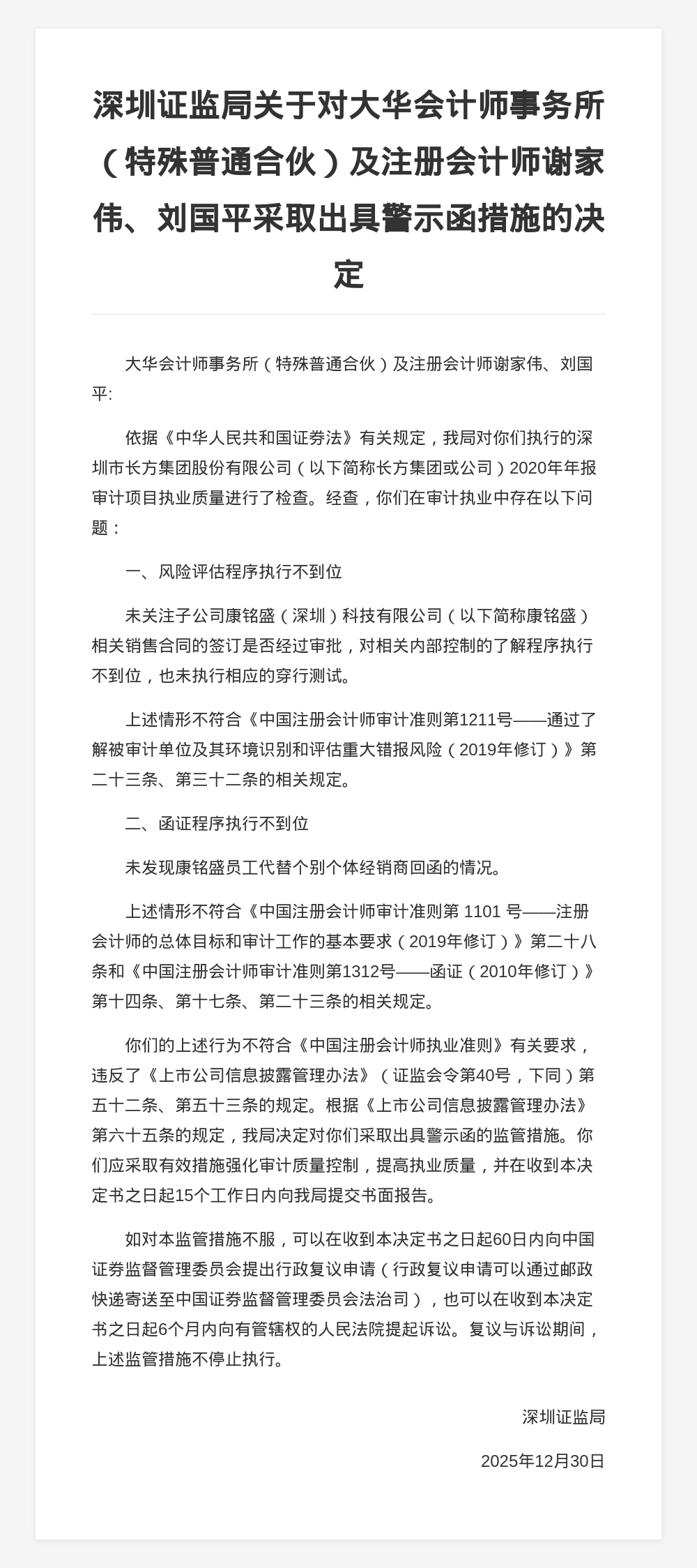 决定书显示,大华会计师事务所(特殊普通合伙)在执行深圳市长方集团股份有限公司2020年年报审计项目中,存在以下问题:风险评估程序执行不到位;函证程序执行不到位。