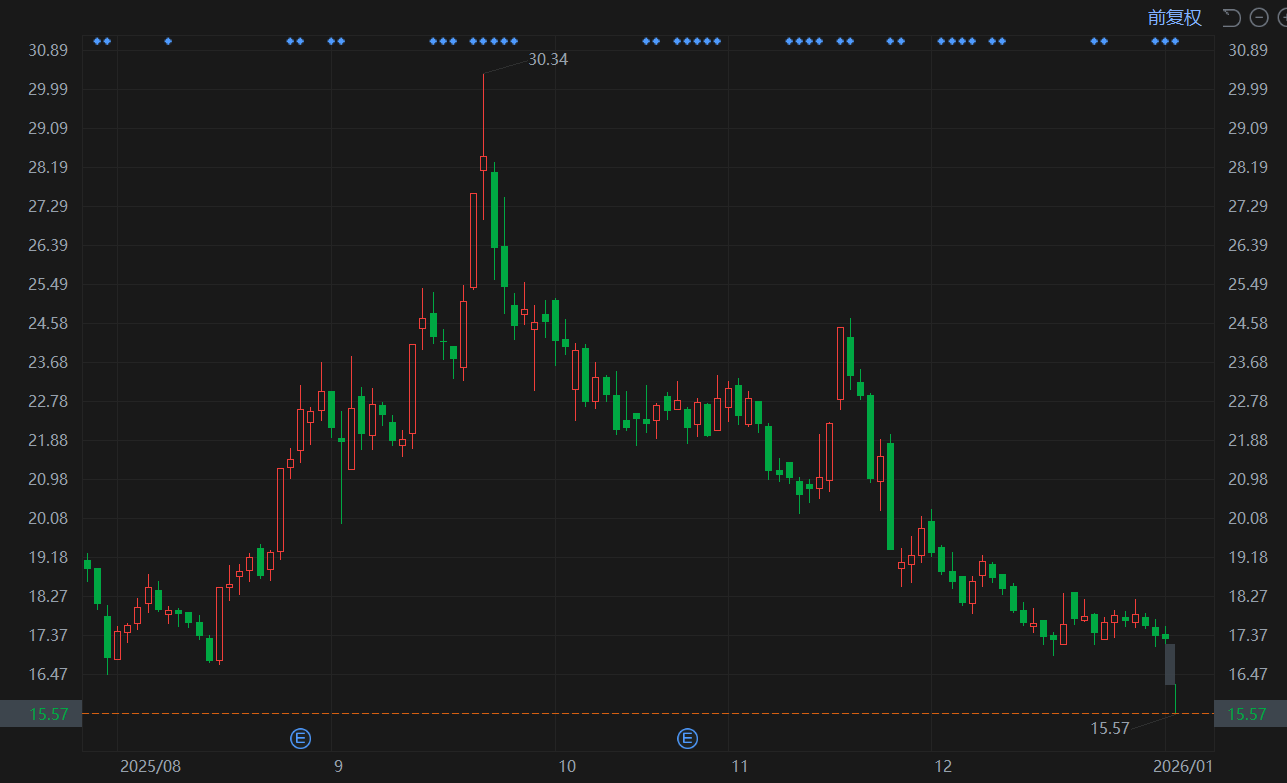登云股份(002715)(002715.SZ)跌停,报15.57元创2025年5月中旬以来新低,总市值21.49亿元。消息上,登云股份昨日盘后公告称,公司实际控制人杨涛因涉嫌非法吸收公众存款罪,于2025年12月25日被北京市公安局朝阳分局执行逮捕。杨涛不在公司担任职务,该事项对公司治理及日常生产经营不构成重大影响。公司将持续关注进展并履行信息披露义务。此外,在2025年12月9日晚登云股份发布股份减持公告,股东北京益科瑞海矿业有限公司拟减持,减持比例不低于公司总股本的0.05%,不超过总股本的0.05%。
