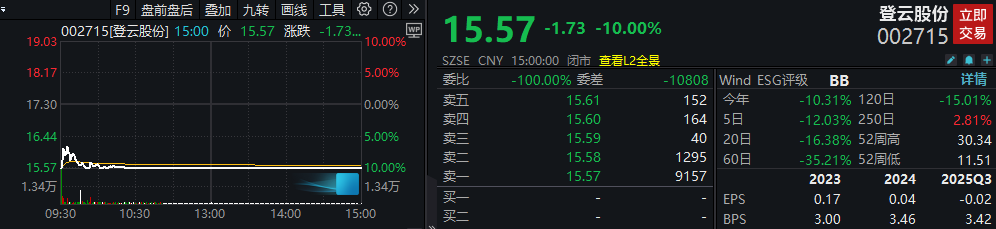 在“慢牛”氛围下,跌停股显得尤为突出。昨日宣布实控人被捕的登云股份(002715)(002715)今日吞下“10CM”跌停,成为今日A股市场唯二跌停股,也是唯一一只非ST跌停股。