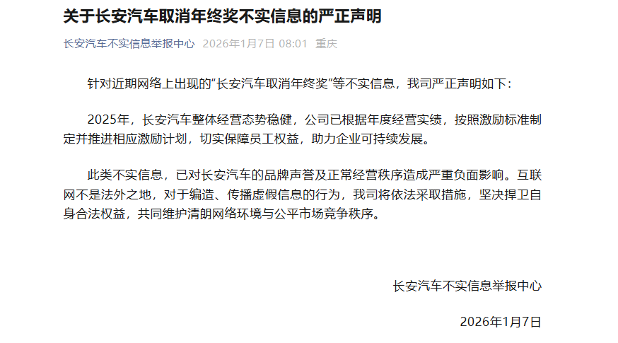 长安汽车方面表示,此类不实信息,已对长安汽车的品牌声誉及正常经营秩序造成严重负面影响。互联网不是法外之地,对于编造、传播虚假信息的行为,公司将依法采取措施,坚决捍卫自身合法权益,共同维护清朗网络环境与公平市场竞争秩序。