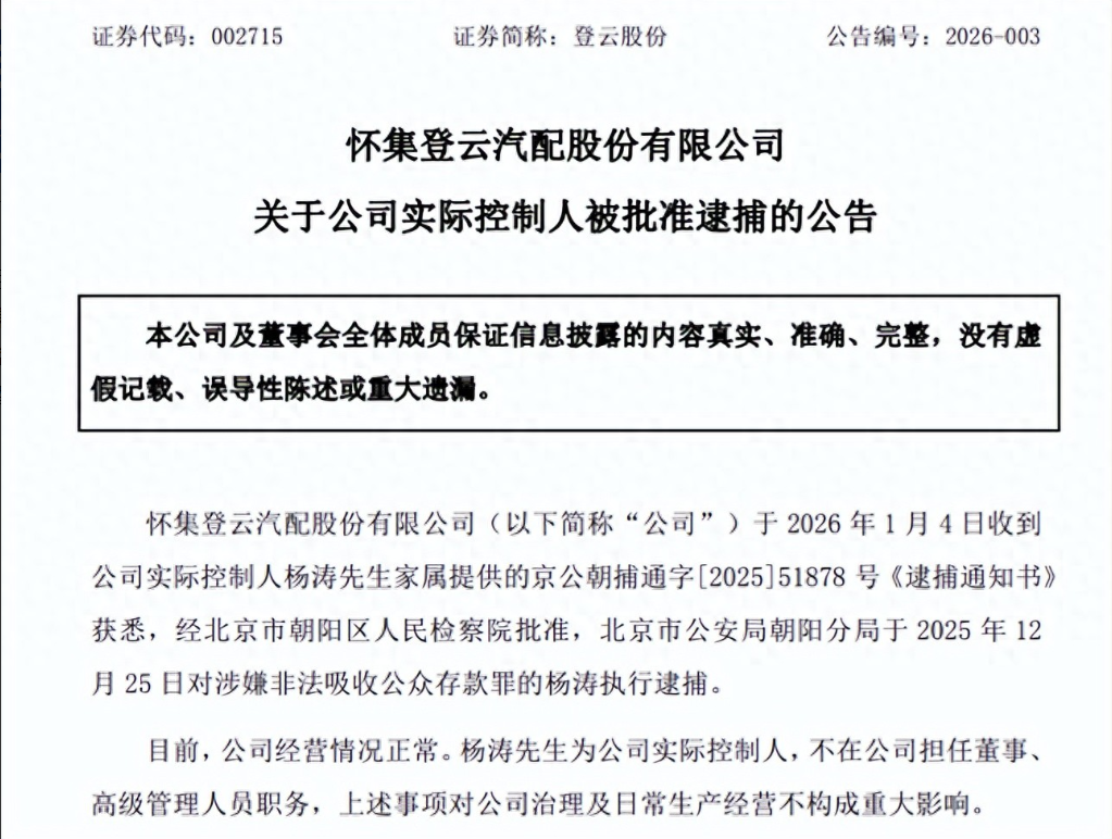 登云股份公告披露,公司于1月4日收到实际控制人杨涛家属提供的《逮捕通知书》,经北京市朝阳区人民检察院批准,北京市公安局朝阳分局已于2025年12月25日对涉嫌非法吸收公众存款罪的杨涛执行逮捕。