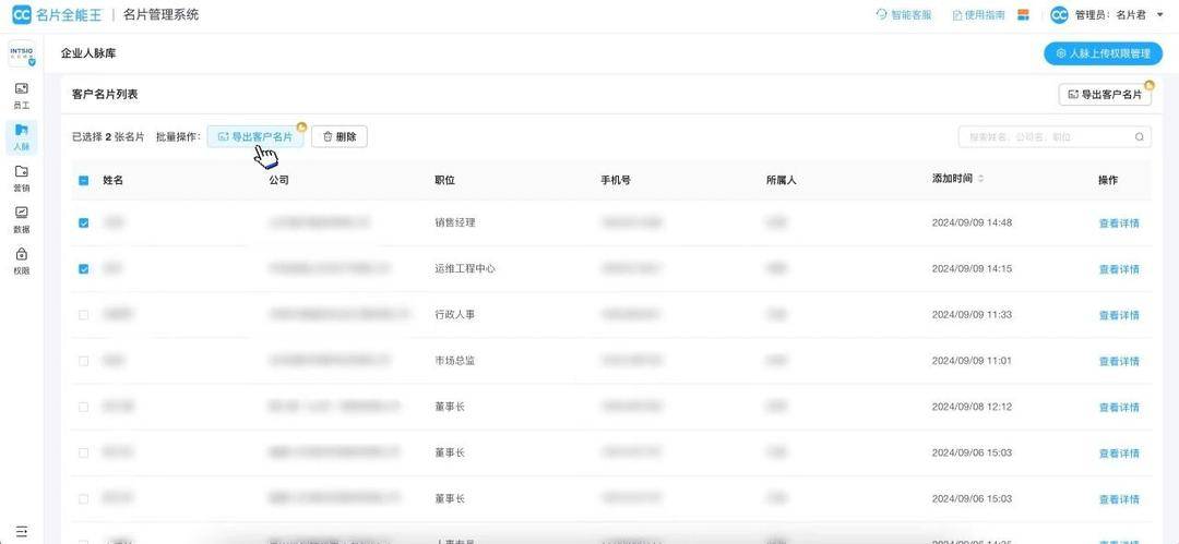管理员可在企业数字名片管理后台查看、管理人脉库
