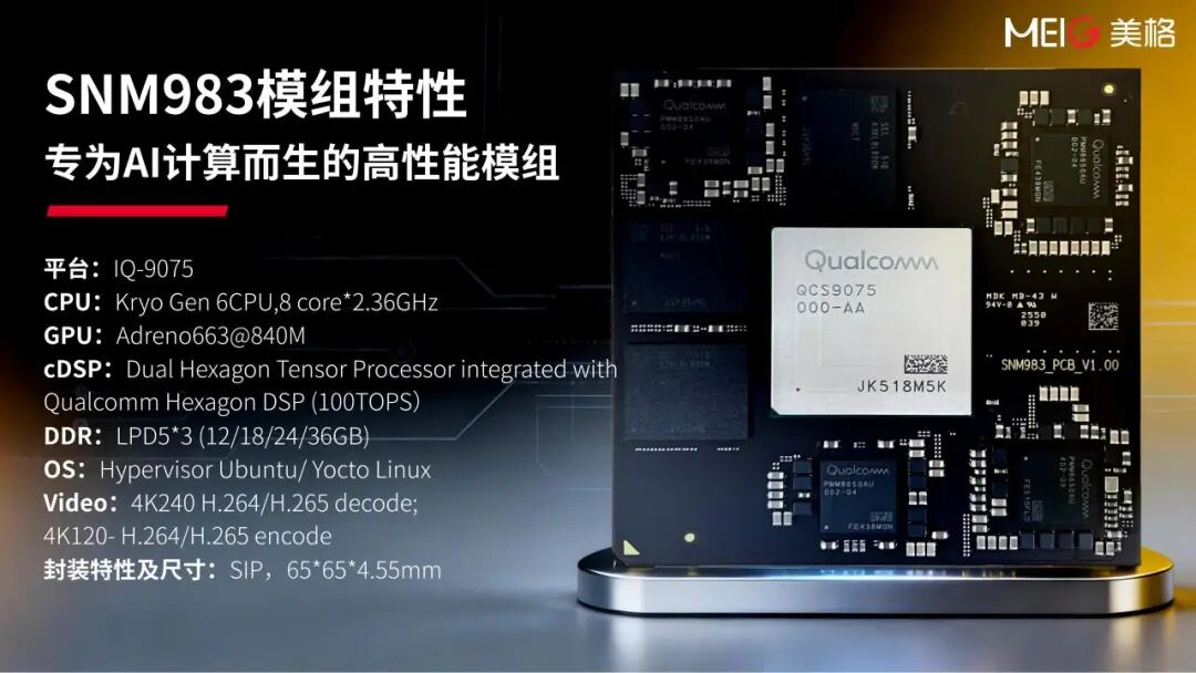 正是在这一产业浪潮下,美格智能(002881)全新100TOPS AI模组SNM983应运而生。这并非一次简单的算力升级,而是一次面向“AI原生”时代的架构革命与设计范式转变。其核心特性在于从传统的“以CPU为中心”彻底转向“以场景和AI为中心”。传统SoC模组以通用CPU为核心,AI算力仅为附加功能;而SNM983则从底层为高复杂度、低延迟的边缘AI推理场景重塑架构,一切设计优先服务于AI任务,其他单元高效协同。