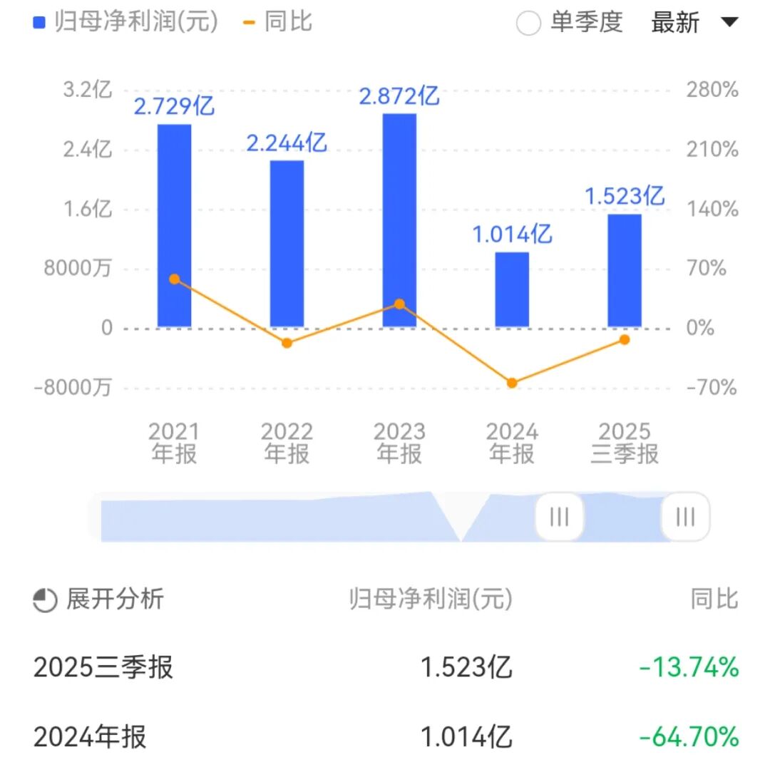 业绩方面,2024年公司营收净利双双出现下滑,净利润降幅更是同比超过六成。2025年前三季度,公司业绩继续承压,实现营收42.66亿元,同比减少6.55%;净利润1.523亿元,同比下滑13.74%。