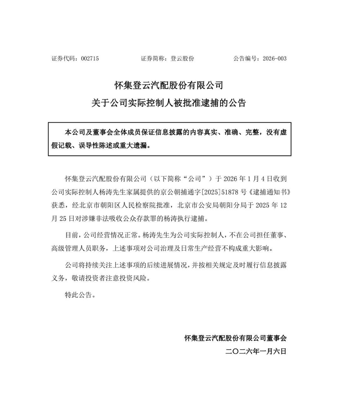 就在前一晚,登云股份发布公告,公司实际控制人杨涛因涉嫌非法吸收公众存款罪,已被北京市公安局朝阳分局执行逮捕。