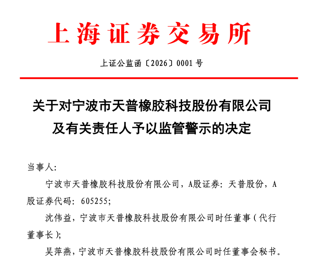 1月5日晚间,天普股份及时任董事(代行董事长)沈伟益、董秘吴萍燕,因利用子公司经营范围炒作“人工智能”热点概念,引发市场猜测和股价异动后未及时进行针对性说明澄清与风险提示,信息披露不准确、不完整,被上交所予以监管警示。