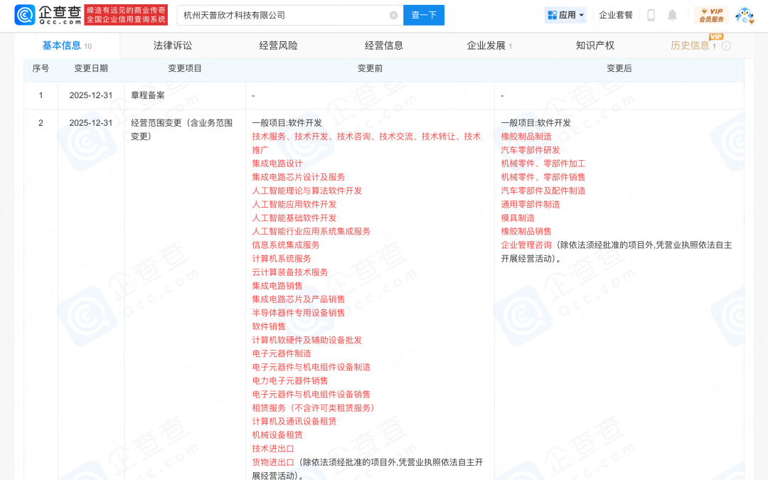 更“有趣”的是,12月31日,天普欣才的经营范围旋即变更为橡胶制品制造、汽车零部件及配件制造等。公开信息显示,天普股份主要从事汽车用高分子材料流体管路系统和密封系统零件及总成的研发、生产及销售,产品主要应用于传统油车整车制造。其子公司变更后的经营范围显然更具合理性,可与天普股份的主营业务相协同。