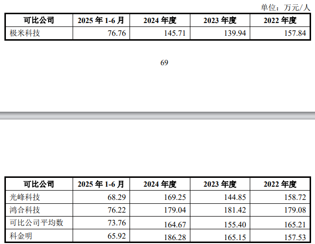 科金明就上述问题在回复中做出了详细解析,公司表示,报告期内,公司人均产值与同行业可比上市公司对比情况如下: