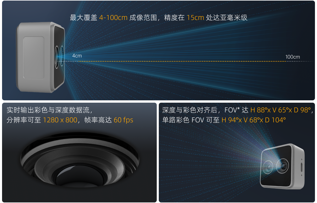 奥比中光销售副总裁Mike McSweeney表示:“Gemini 305将最近成像距离近至4厘米,感知盲区减少了43%。结合超大视场角与可切换数据流,它在近距精细作业中显著提升感知能力,为细小零件识别、柔性抓取及人形机器人提供理想视觉方案。”