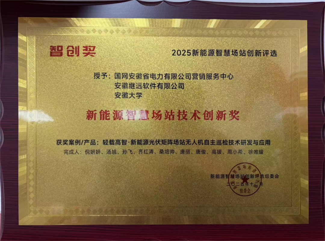 近日,在杭州举办的2025新能源智慧场站建设大会暨创新评选活动上,由国网安徽省电力有限公司营销服务中心牵头,国网信通(600131)股份继远软件深度参与研发的“轻载高智 新能源光伏矩阵场站无人机自主巡检技术”,凭借突出的创新性、实用性和推广价值,荣获“智创奖—新能源智慧场站技术创新奖”。