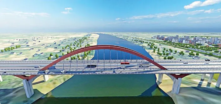该项目位于孟加拉国北部重要交通枢纽迈门辛市,横跨布拉马普特拉河支流,是连接当地城乡经济圈的关键纽带。大桥主桥长320米,宽42.15米,为三孔钢箱拱桥;其中180米主跨为中承式吊杆钢拱桥,采用顶进法施工,施工技术含量高。项目建成后将极大缓解区域交通压力,提升物流效率,为当地农业、制造业发展提供有力支撑。