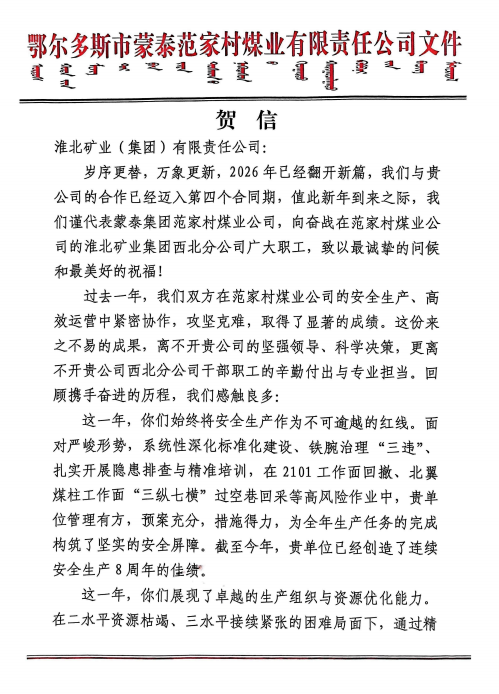 1月5日,淮北矿业(600985)集团收到鄂尔多斯市蒙泰范家村煤业有限责任公司发来的贺信。贺信高度赞扬了西北分公司在范家村煤矿项目中所展现的安全生产能力与高效运营水平,充分肯定了双方过去一年的丰硕合作成果,并对未来深化协作、共促发展表达了坚定信心。