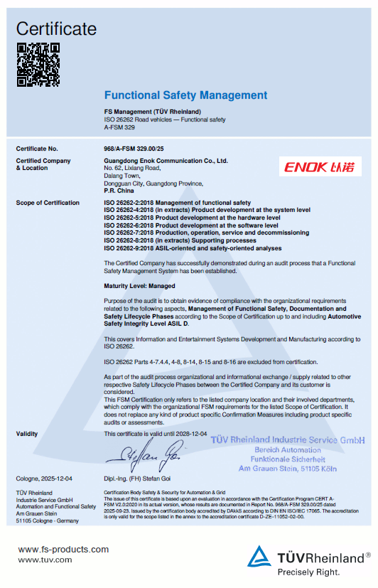 近日,国际独立第三方检测、检验和认证机构德国莱茵T V集团(T V Rheinland)正式向福日电子(600203)成员企业以诺通讯颁发ISO26262:2018汽车功能安全管理体系认证证书。该认证确认,以诺通讯已按照汽车功能安全最高等级ASIL-D要求,建立了产品全生命周期的功能安全开发与管理流程体系,标志着公司在汽车电子通讯领域的功能安全能力达到国际先进水平。