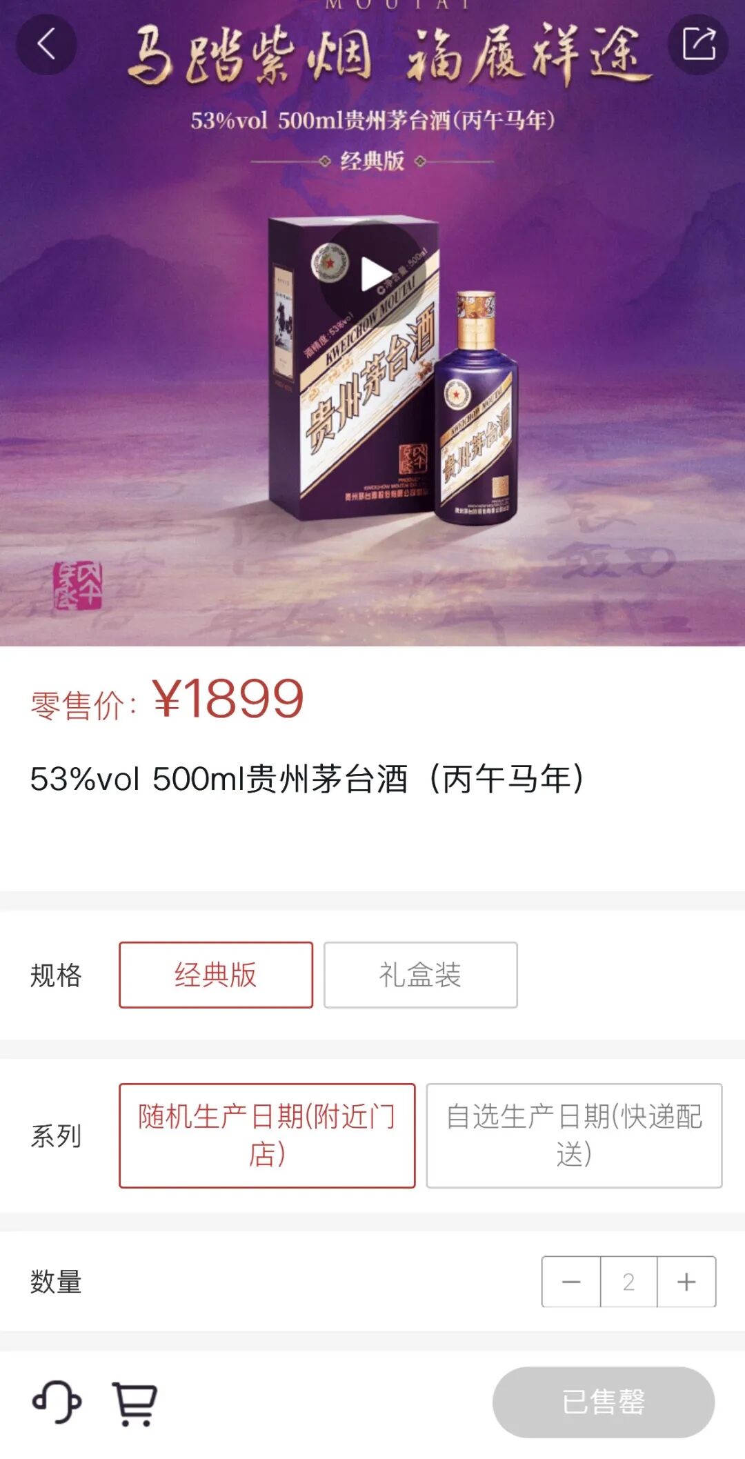 昨天,马年生肖茅台正式在i茅台app上市发售,在白酒行业调整加剧的大背景下,变化正在发生——过去五年生肖茅台的官方指导价都是2499元/瓶,今年购买门槛有所降低:提供了经典版、礼盒装和珍享版三个版本,官方定价分别为1899元/瓶、3789元/盒(两瓶)和2499元/瓶。其中,经典版和礼盒装还支持自选生产日期。